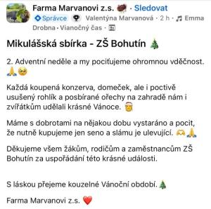 V prvním prosincovém týdnu se naše škola zapojila do krásné předvánoční akce – Mikulášské nadílky pro zvířata z Farmy Marvanovi. Žáci, rodiče i zaměstnanci školy společně vytvořili sbírku, která potěšila nejen zvířecí obyvatele farmy, ale i její majitele.