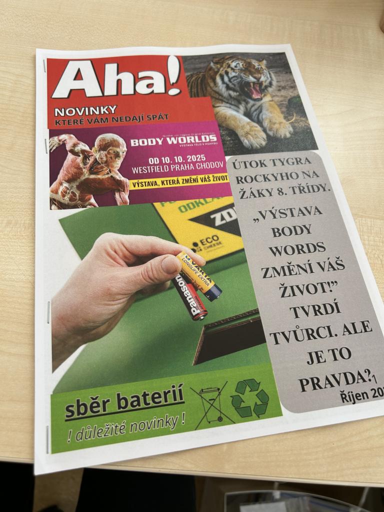 a korektorů. Nechyběla také hlava celého redakčního týmu – šéfredaktor. Žáci si rozdělili role, vymýšleli dramatické titulky a témata, která vždy vycházela z reálných námětů – třídění odpadu, dopadů na životní prostředí nebo správného nakládání s elektroodpadem. Výsledkem byly originální, vtipné, ale zároveň poučné příspěvky, které ukázaly, že i bulvár může informovat o důležitých věcech.