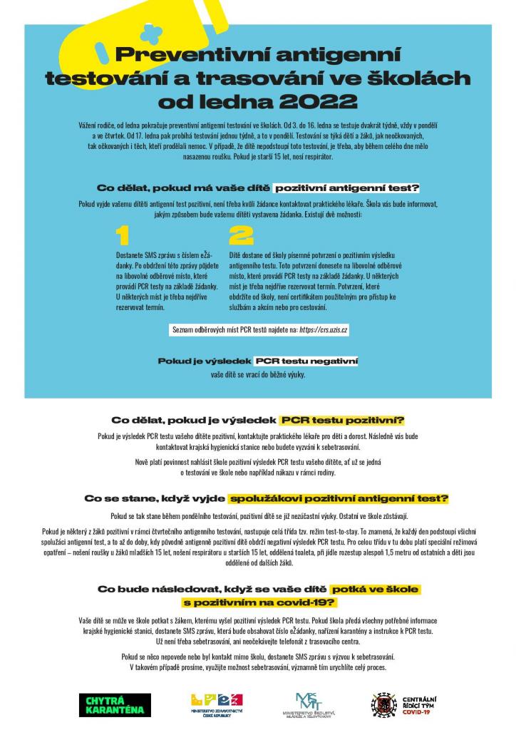 Preventivní plošné testování antigenními testy ve školách se bude v období od 3. ledna do 16. ledna provádět každé pondělí a čtvrtek (2 x týdně).